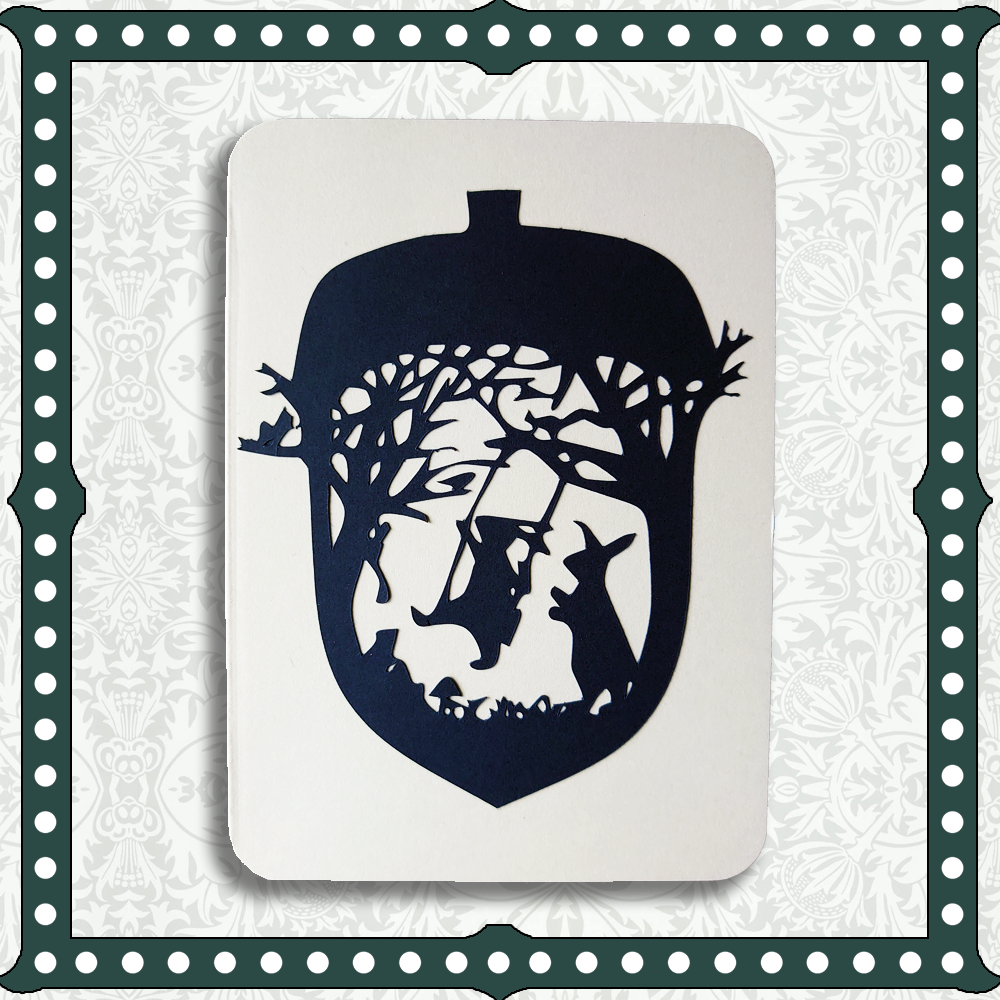 Step into a storybook world, framed by leafy boughs and nestled inside the heart of an acorn. This enchanting collection features delicate papercut scenes of woodland friends.