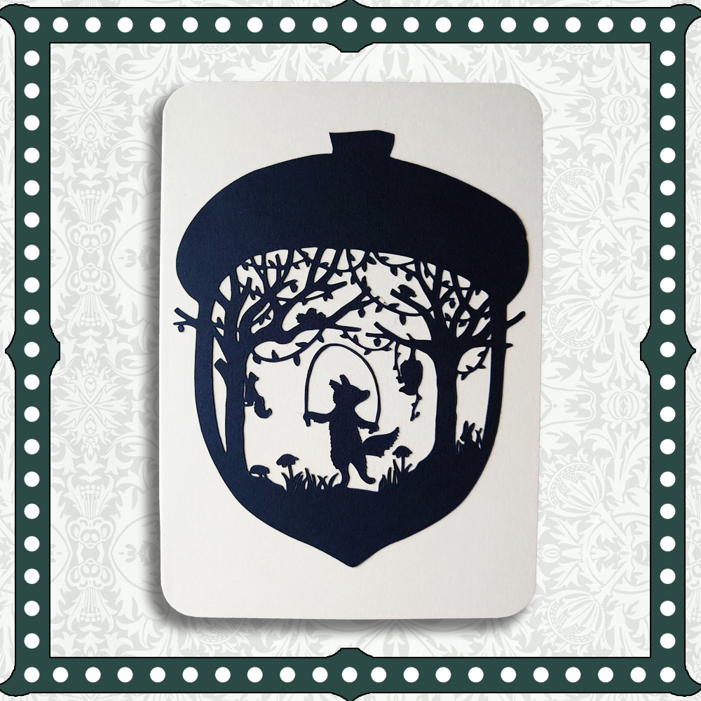 Step into a storybook world, framed by leafy boughs and nestled inside the heart of an acorn. This enchanting collection features delicate papercut scenes of woodland friends.